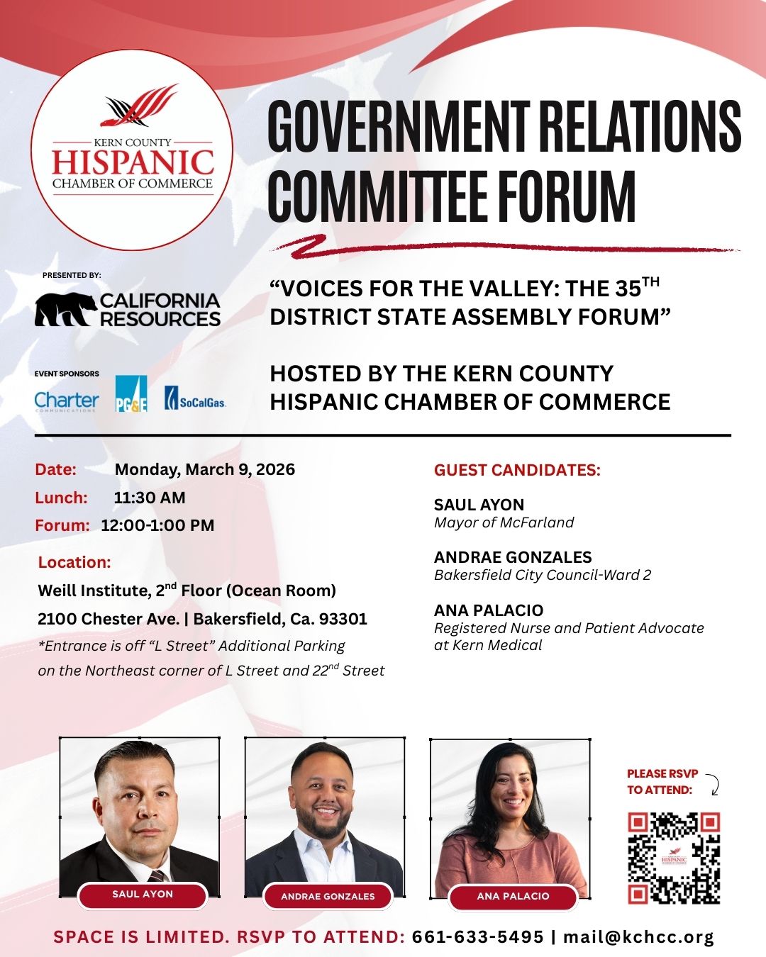 GRC MEETING RSVP FORMPlease RSVP and join us for our March 2026 Government Relations Committee Forum on Monday, March 9, presented by California Resources Corporation. “Voices for the Valley: The 35th District State Assembly Forum” hosted by the Kern County Hispanic Chamber of CommercePlease enable JavaScript in your browser to complete this form.Name *FirstLastEmail *PhoneCompany | AffiliationSubmit