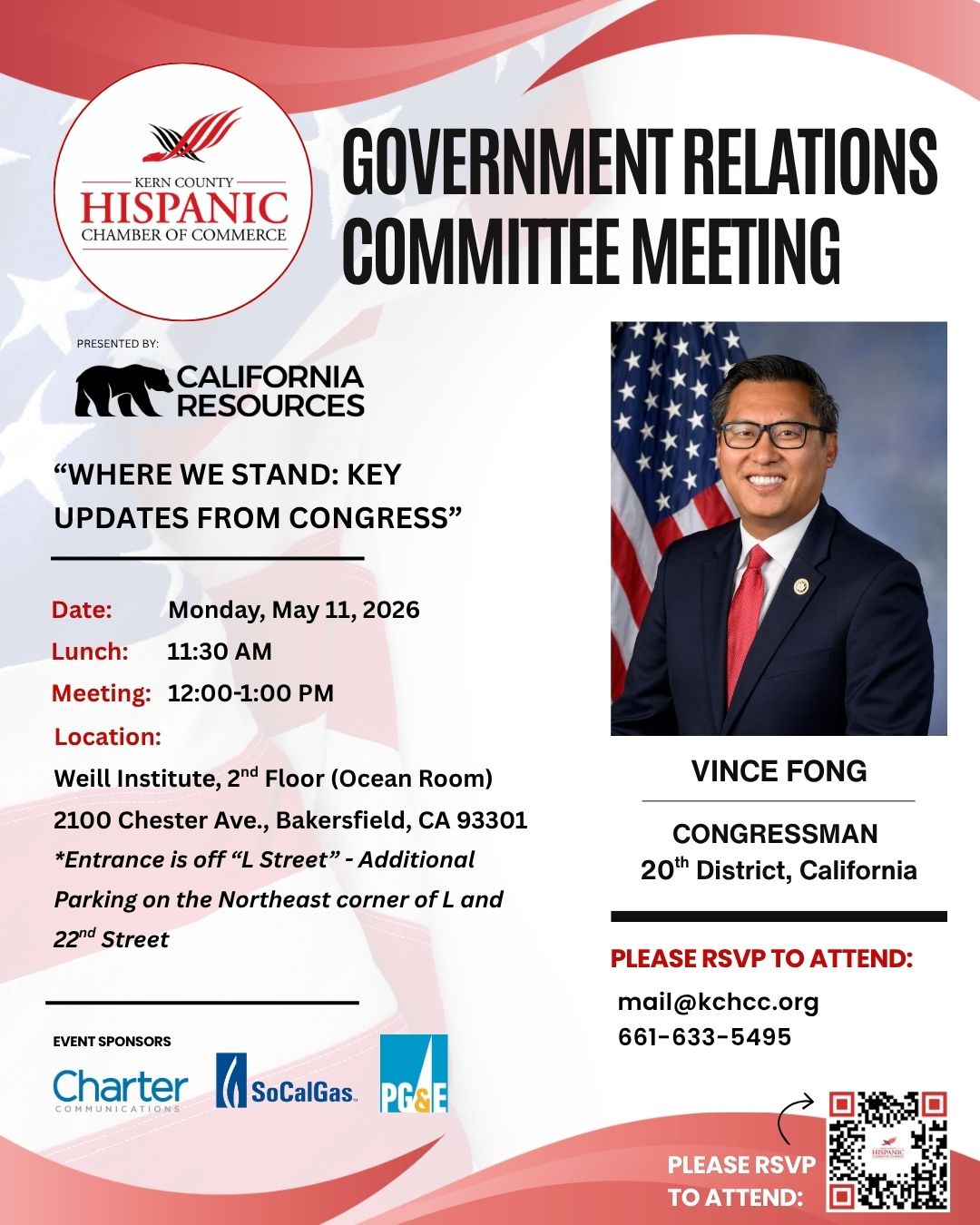 GRC MEETING RSVP FORMPlease RSVP and join us for our May 2026 Government Relations Committee Meeting on Monday, Mat 11, presented by California Resources Corporation. “Where We Stand: Key Updates from Congress” Date: Monday, May 11, 2026 Lunch: 11:30 a.m. Meeting: 12:00 – 1:00 p.m. Location: Weill Institute, 2nd Floor (Ocean Room) 2100 Chester Ave., Bakersfield, Ca. 93301 *Entrance is off “L Street” Additional Parking on the Northeast corner of L and 22nd Street GUEST SPEAKER: Congressman Vince Fong, 20th District, California PLEASE RSVP TO ATTEND: mail@kchcc.org or 661-633-5495Please enable JavaScript in your browser to complete this form.Name *FirstLastEmail *PhoneCompany | AffiliationSubmit